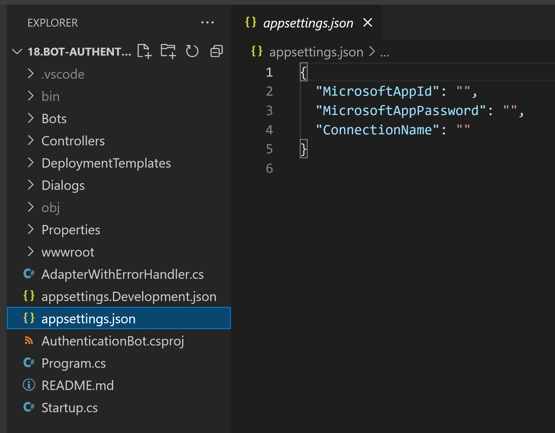 To get our code sample to work, we need to add these 3 values to the appsettings.json: