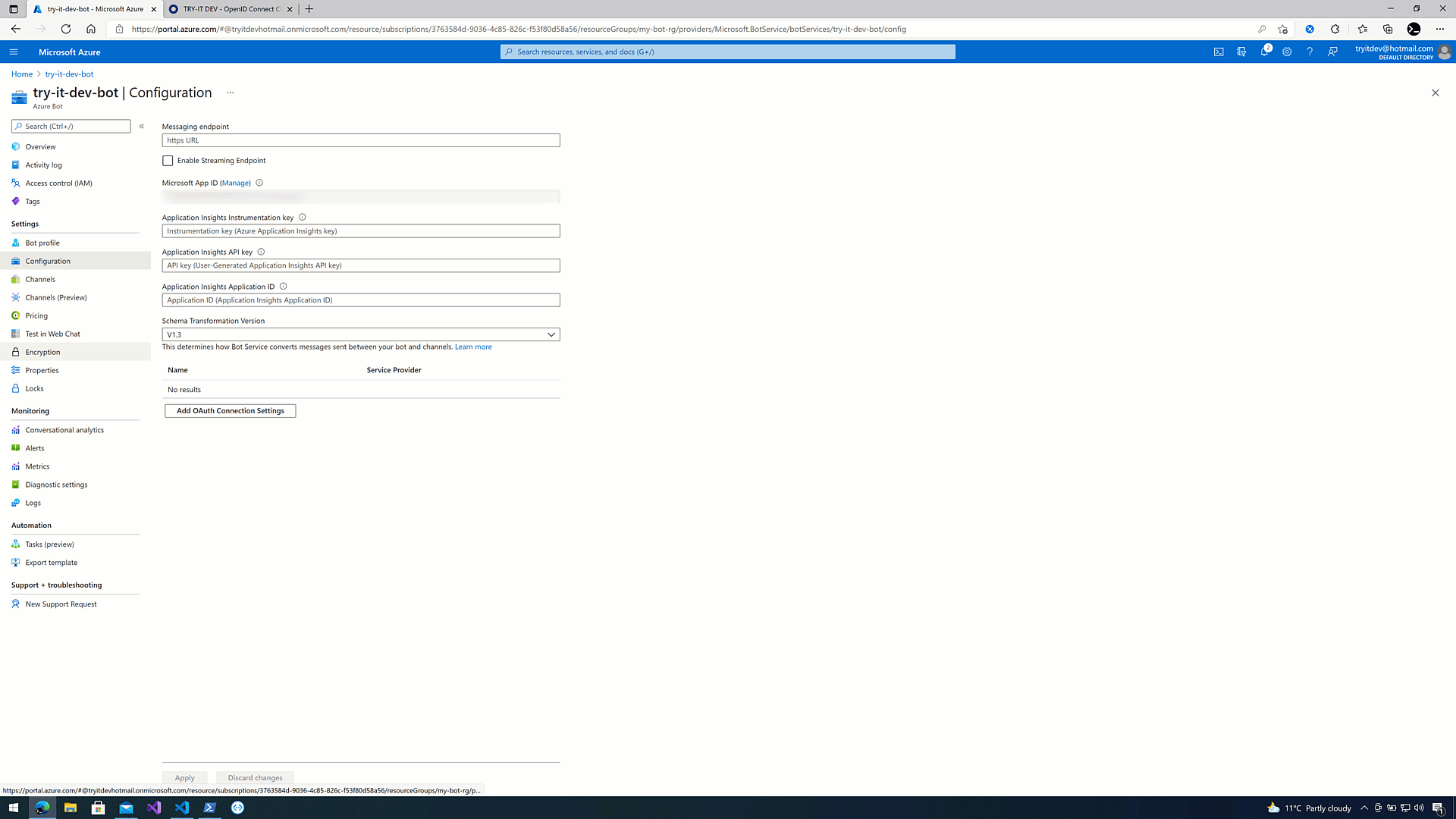 We now need to add OAuth Connection settings to our Azure Bot Service. We can do so within the Azure Portal as follows: