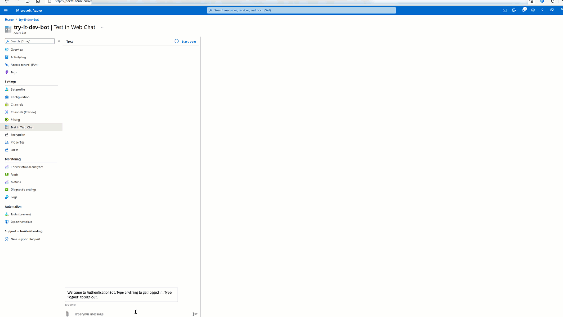 Once you save your settings, you are now ready to test your bot authentication. You can do so within the Azure Bot Service by navigating to Test In Web Chat. It looks something like so ...