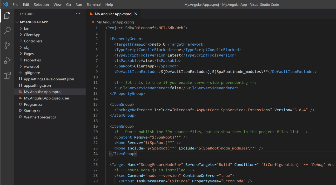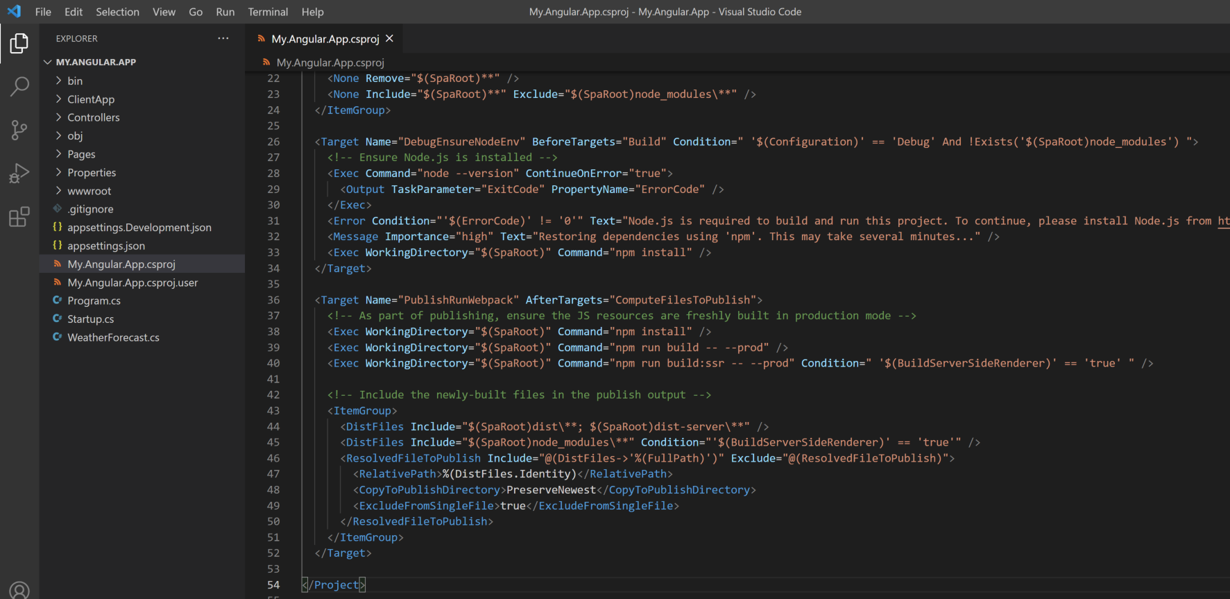 The next section Target with the PublishRunWebpack identifier ensures that your projects, both the UI project running angular or react as well as your dotnet project is correctly published. Now when you do setup your build and deploy pipelines, this is the section that you are most likely to change to suit your needs.