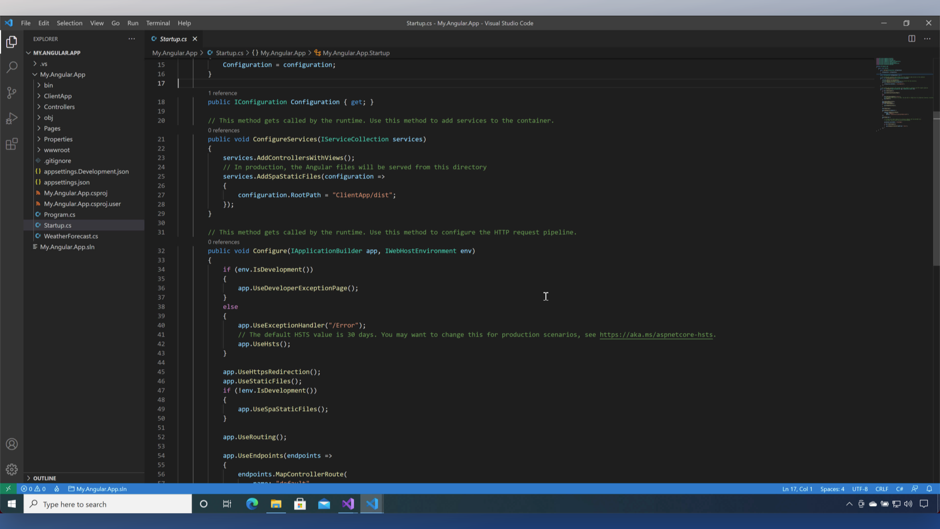 Configure() also has the UseSpa extension method. In development this allows us to serve the client via npm using the UseAngularCliServer and UseReactDevelopmentServer extension methods on the IWebHostEnvironment