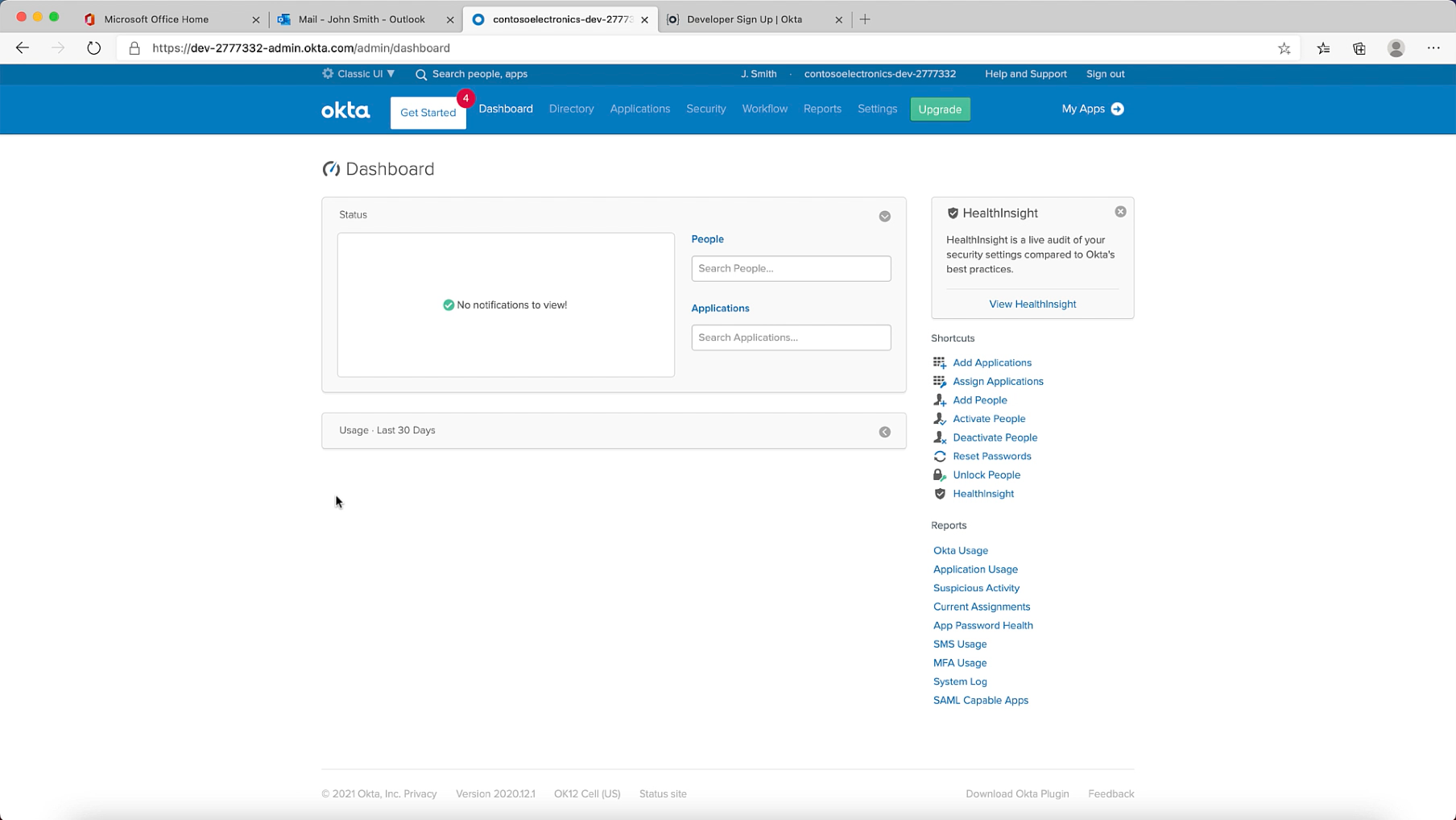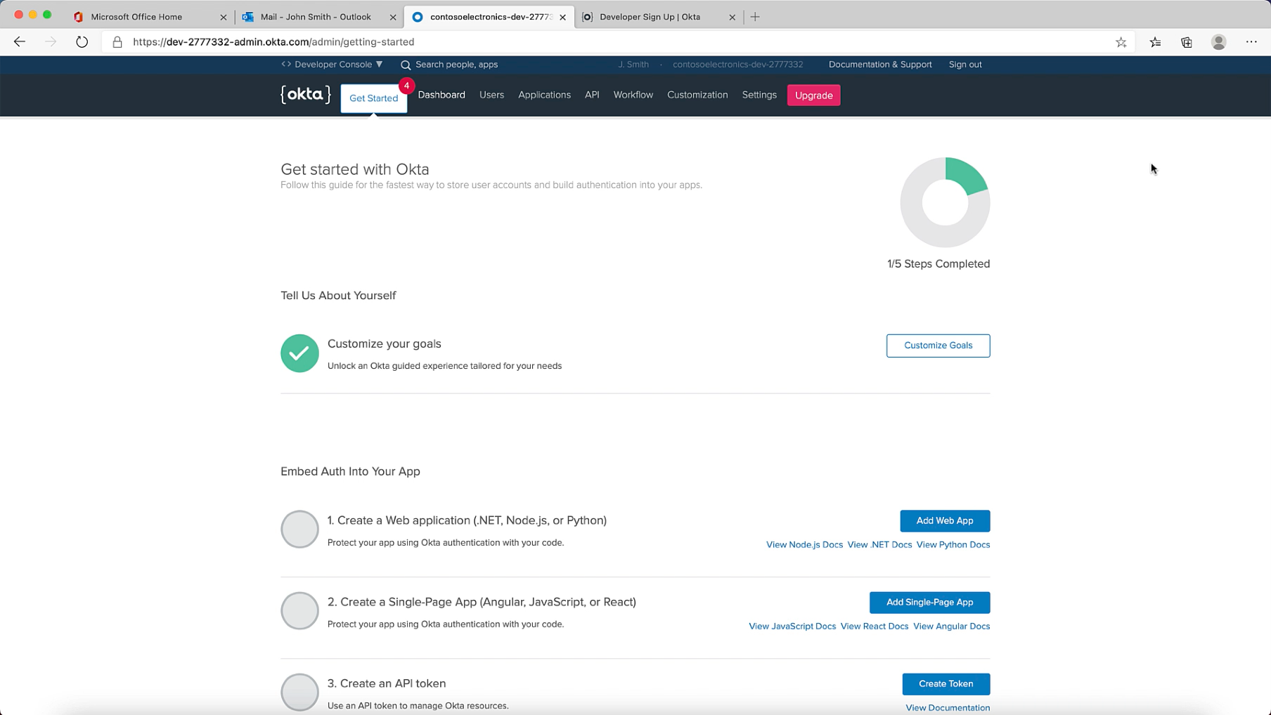 After signing up, you'll be presented with your Okta cell's developer console. Okta allows you to switch between this view & the Classic UI. Personally I like the Classic UI.