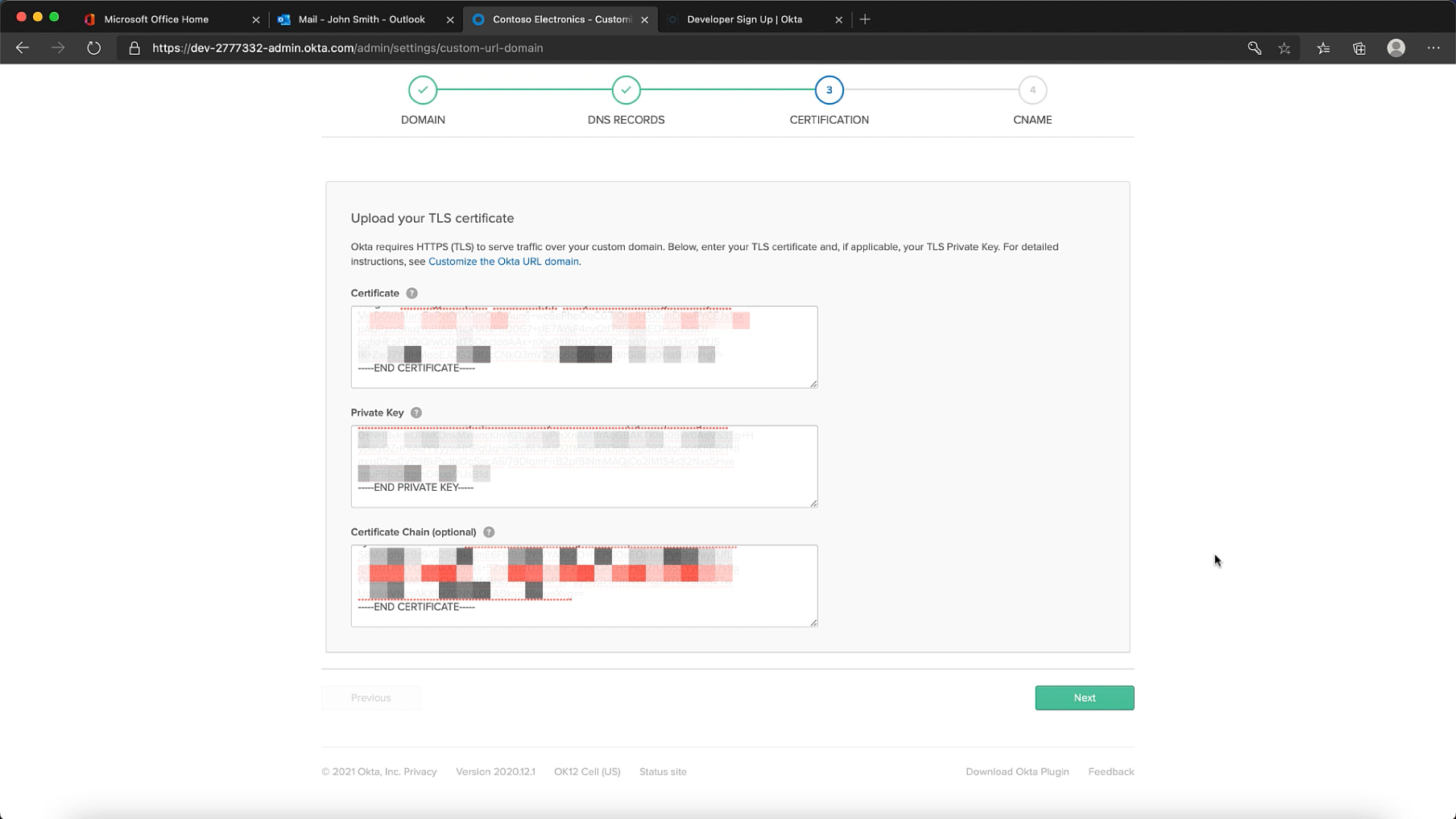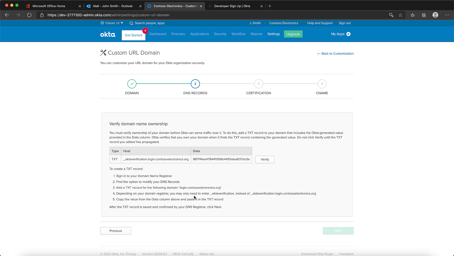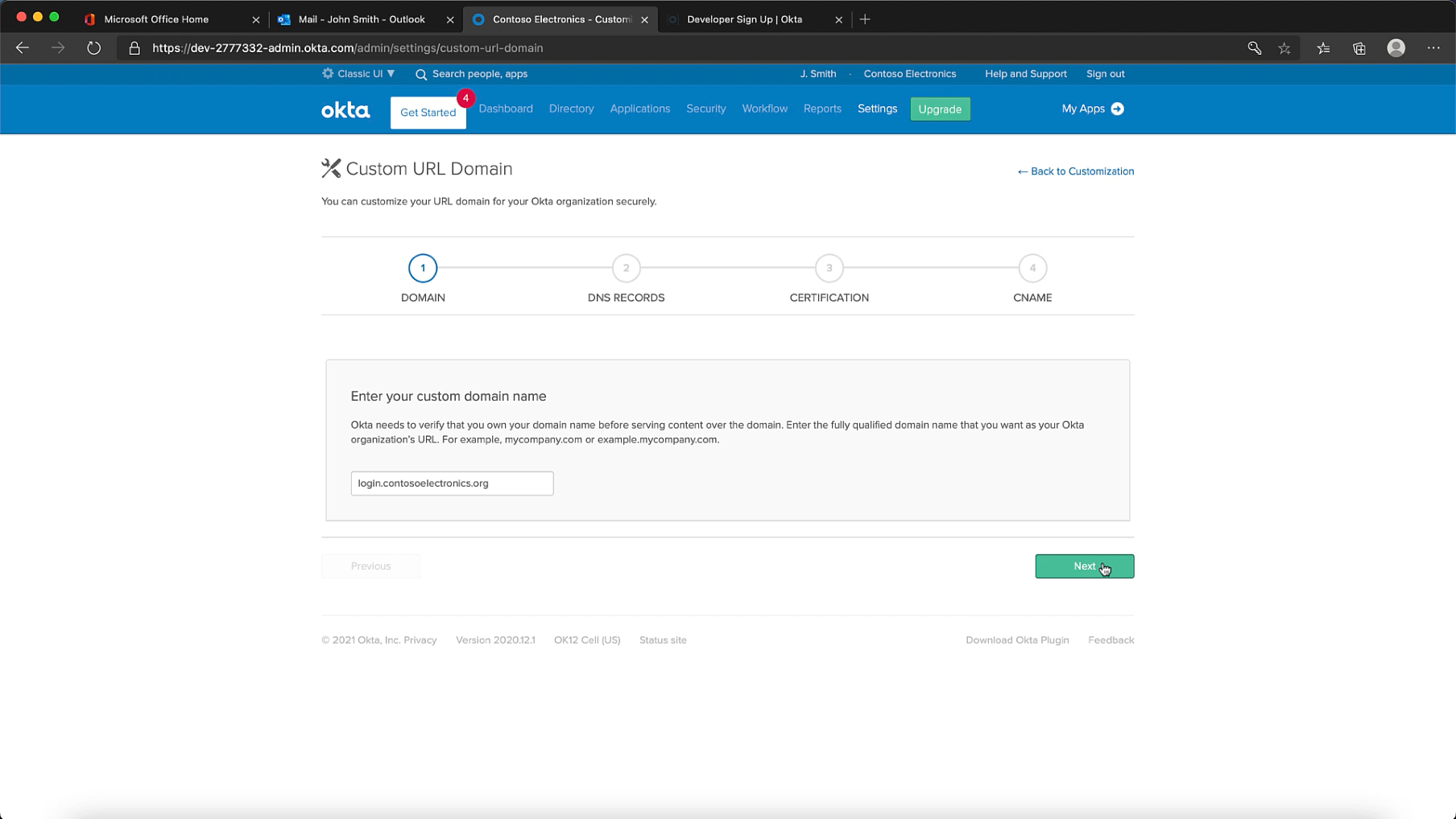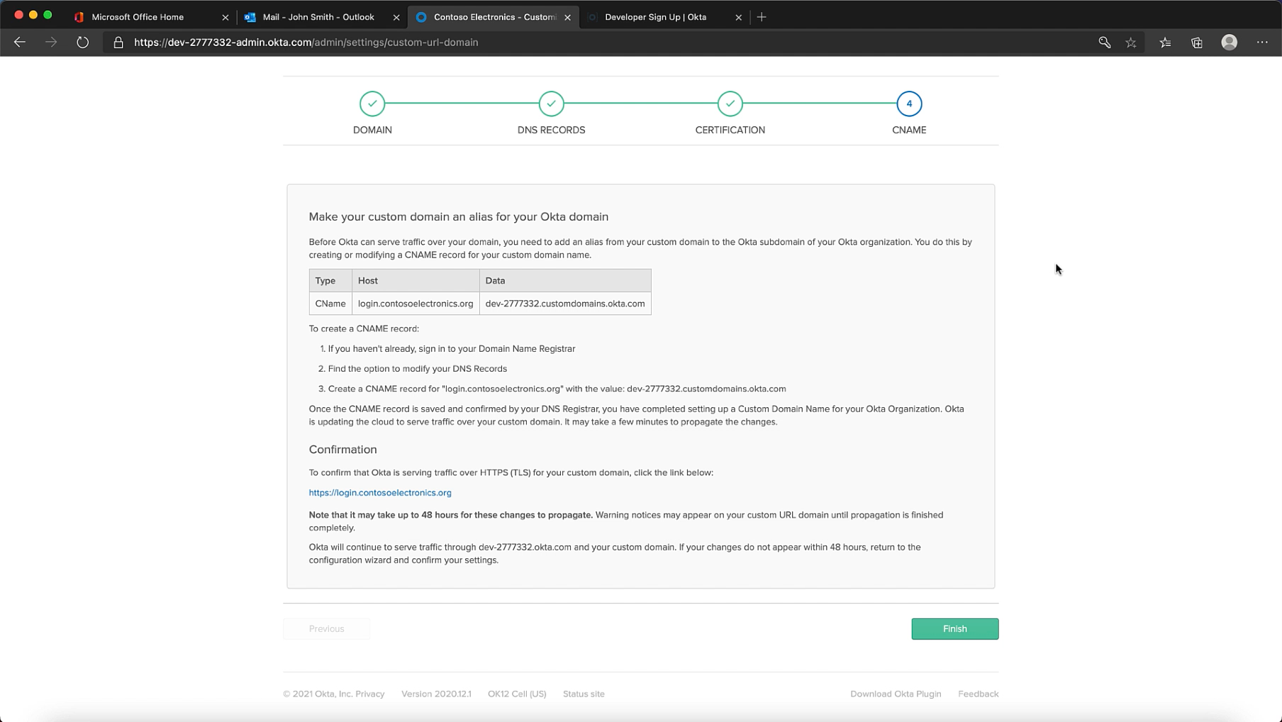 Okta in turn will generate hostname for you, which should appear in the verification email. Might be a good idea to copy it for later.