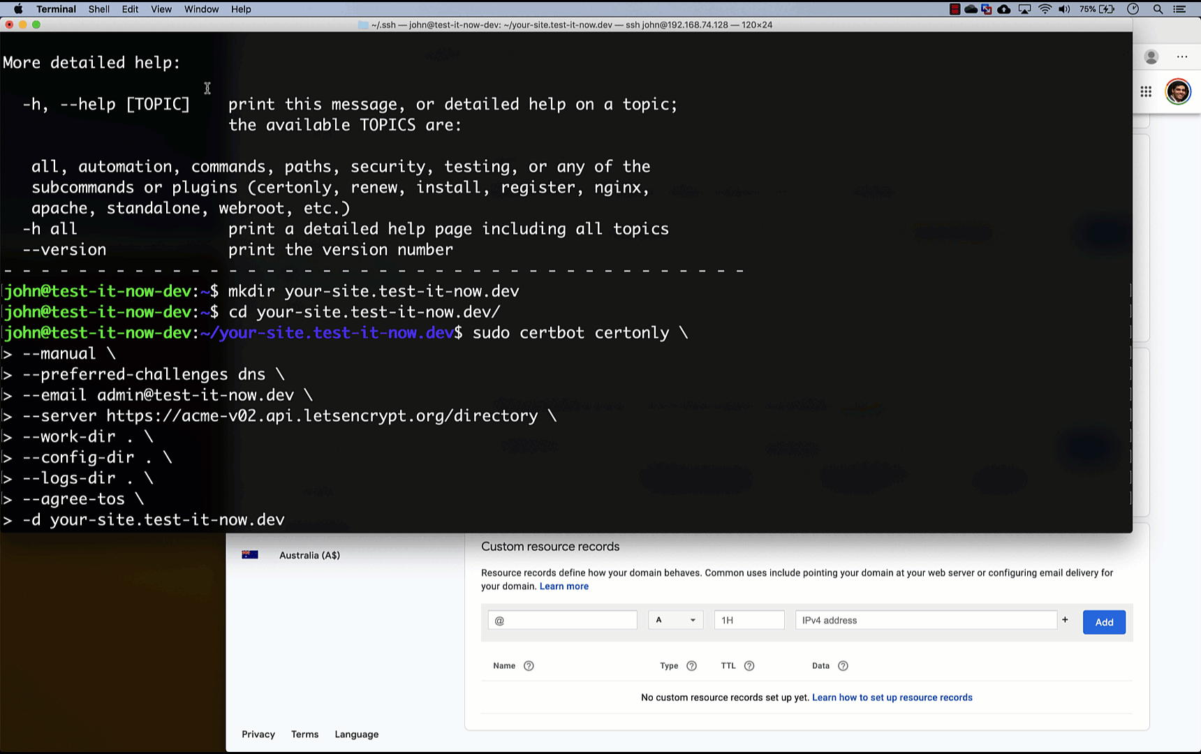 In this post I'll show you how to obtain a certificate using the manual approach. Using this approach, we can obtain a certificate by running certbot on a machine other than your target server.